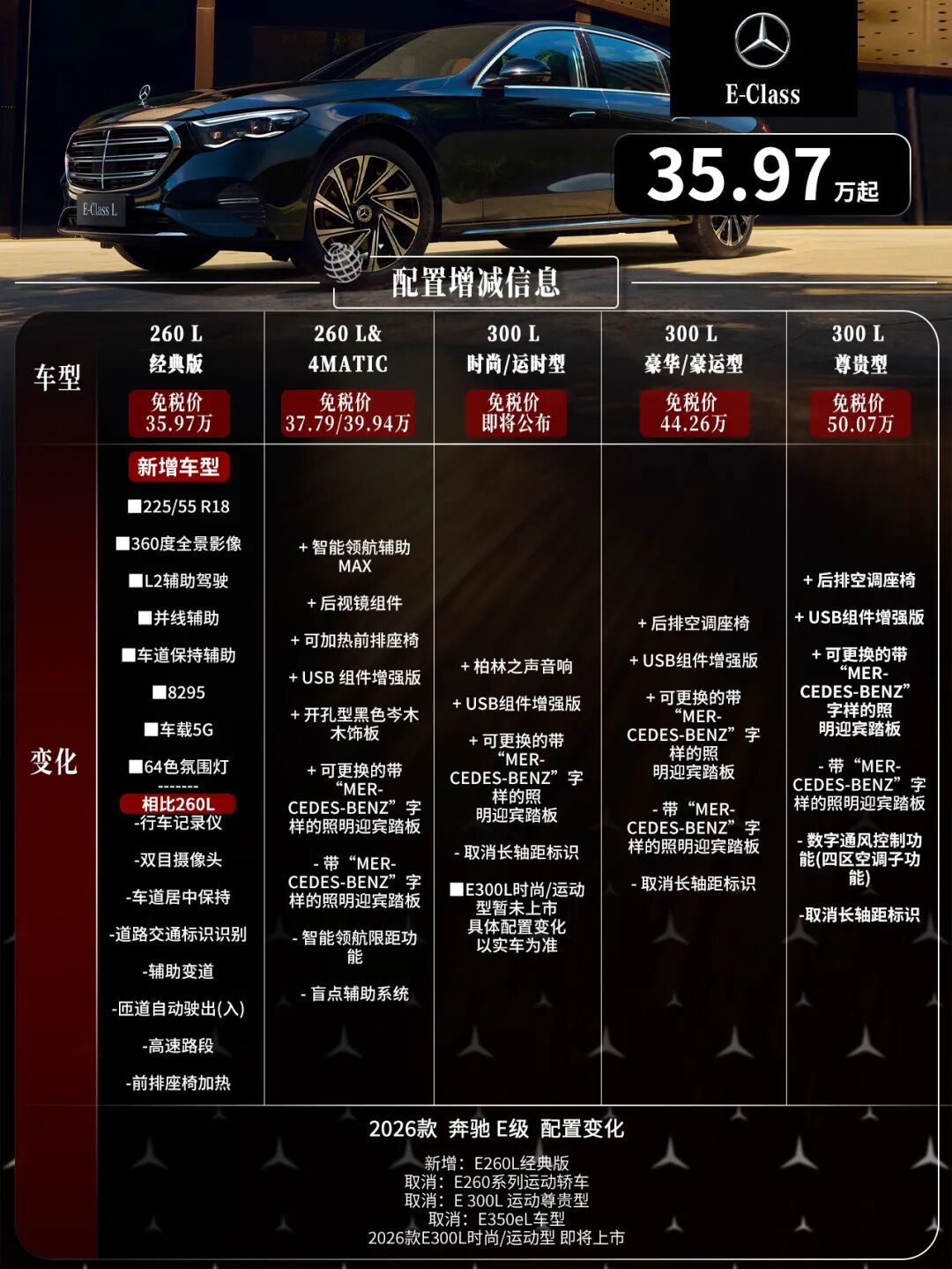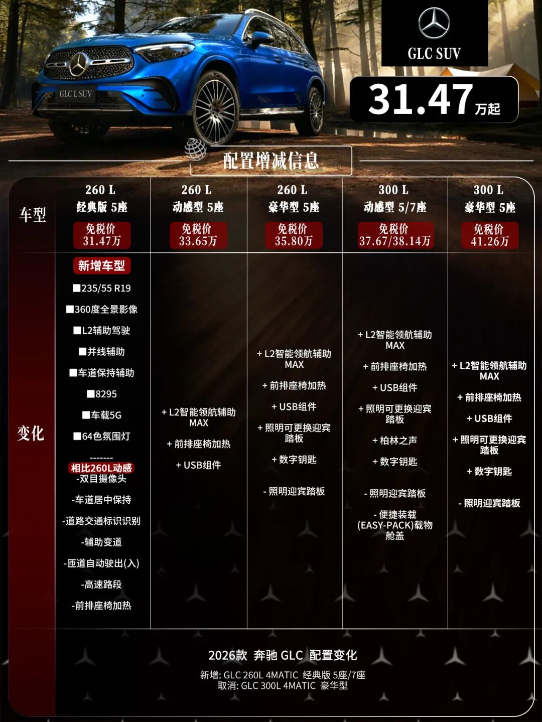 北京奔驰Mercedes-Benz 留学生免税车新款上市 ■GLC级新增入门版车型,免税价进一步下探 ■E级车新增入门版车型,多车型取消,配置提升 ■C级车新增特别版车型,配置更高,性价比大大提升 ■GLB级新增典藏版车型,配备柏林之声、360°等 奔驰GLC级 免税价:31.47-41.26万元 2026款GLC级车提供260L和300L系列车型 ■新增:GLC 260 L 4MATIC 经典版 5座 ■取消:GLC 300 L 4MATIC 豪华型 7座 推荐配置: 2026款 GLC 300L 动感5座 免税价37.67万元,全款落地价≈38.87万元 奔驰E级 免税价:35.97-50.07万元 2026款奔驰E级车提供E260L和E300L系列车型 ■E260L新增经典版;取消E260系列大标车型 ■E300L尊贵运动版取消;E300L全系标配柏林之声 ■E350eL插电混动车型取消 ■E300L时尚/运动型即将上市 推荐配置: 2026款 E300L豪华型 免税价44.26万元,全款落地价≈45.56万元 奔驰C级 免税价:25.66-29.09万元 2026款奔驰C级车提供C200L和C260L系列车型 ■全系搭载2.0T发动机 ■多车型配备柏林之声音响 ■取消长轴距标识 推荐配置: 2026款 C260L运动特别版 免税价27.05万元,全款落地价≈28.05万元 奔驰GLB级 免税价:22.12-24.78万元 2026款奔驰GLB级车提供200和220系列车型 ■新增GLB220典藏版车型 ■多车型配备柏林之声音响 ■入门版车型配置提升 推荐配置: 2026款 GLB 220典藏版 免税价24.78万元,全款落地价≈25.58万元 说起留学生免税车,奔驰绝对是常年霸占关注榜的顶流选手!这次新款重磅上市,直接把竞争力拉满到新高度。 作为豪华品牌里的标杆,奔驰一直以优雅质感和扎实品质圈粉无数,而针对留学生群体的免税政策更是诚意满满,不仅能省去高额购置税,还有专属优惠,而且新款还在设计、配置上全面升级:不管是更具年轻化的外观线条、科技豪华感拉满的内饰座舱,还是更贴合日常通勤的实用配置,都精准戳中留学生的审美与需求。